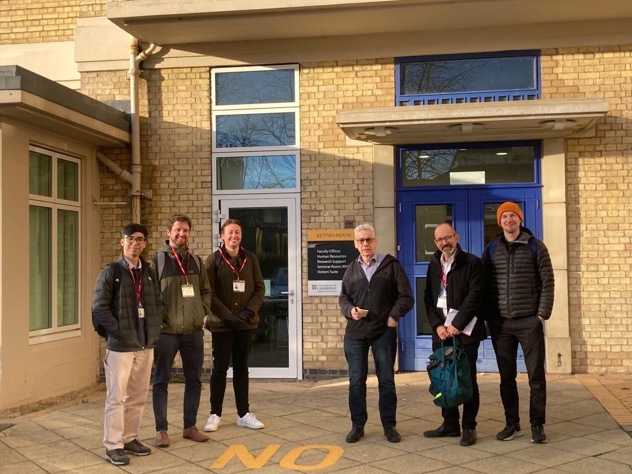 The team meets with university energy experts at Keynes House, from left, Marcus Tang, Salix, Robert Throssell, Salix, Lloyd Ross from the Department for Energy Security and Net Zero, Martin Kernan who is facilities project manager at the Cambridge Judge Business School, sustainable construction manager Alexander Reeve and Sebastian Lunt from Salix